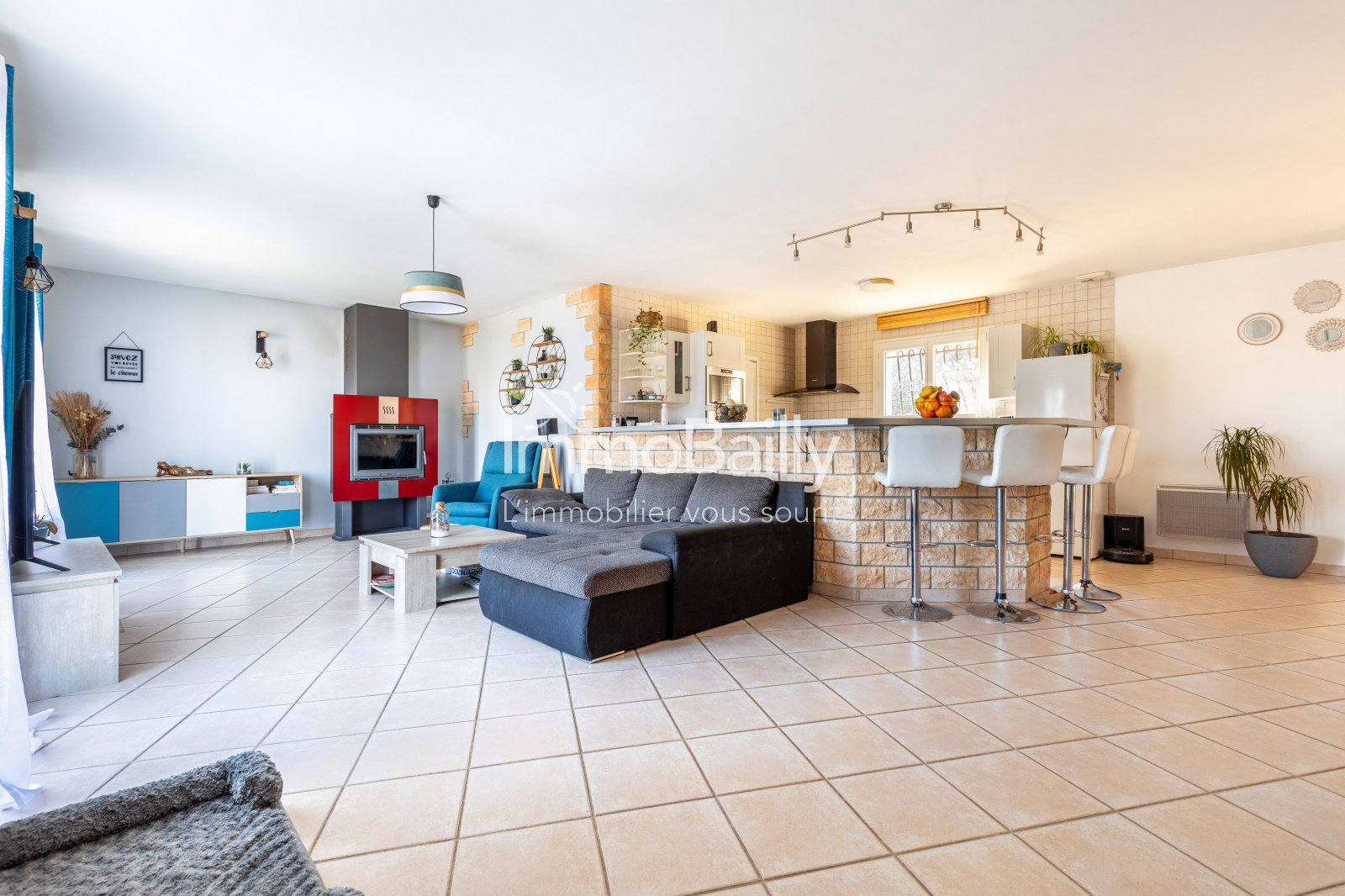 Une pièce de vie de 58m², avec poêle à bois et cuisine ouverte.