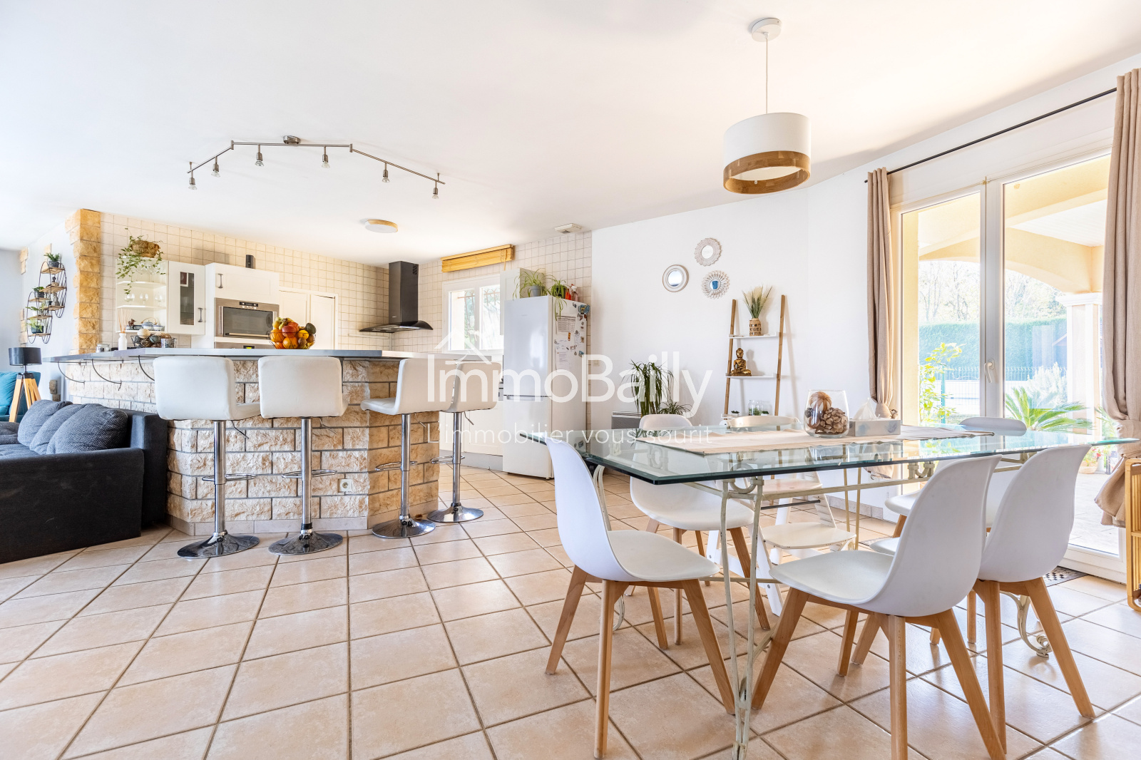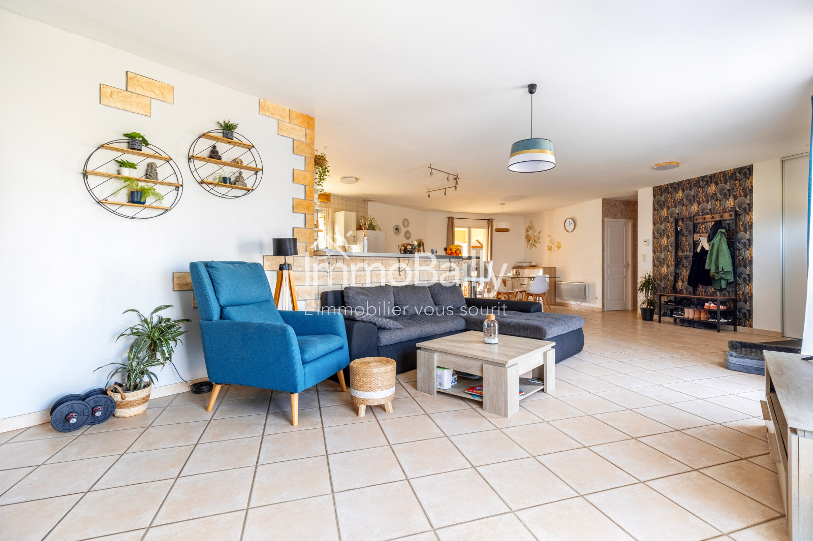 Dans un quartier calme, une maison d'environ 100m² disposant d'un grand salon-séjour avec cuisine et cellier.