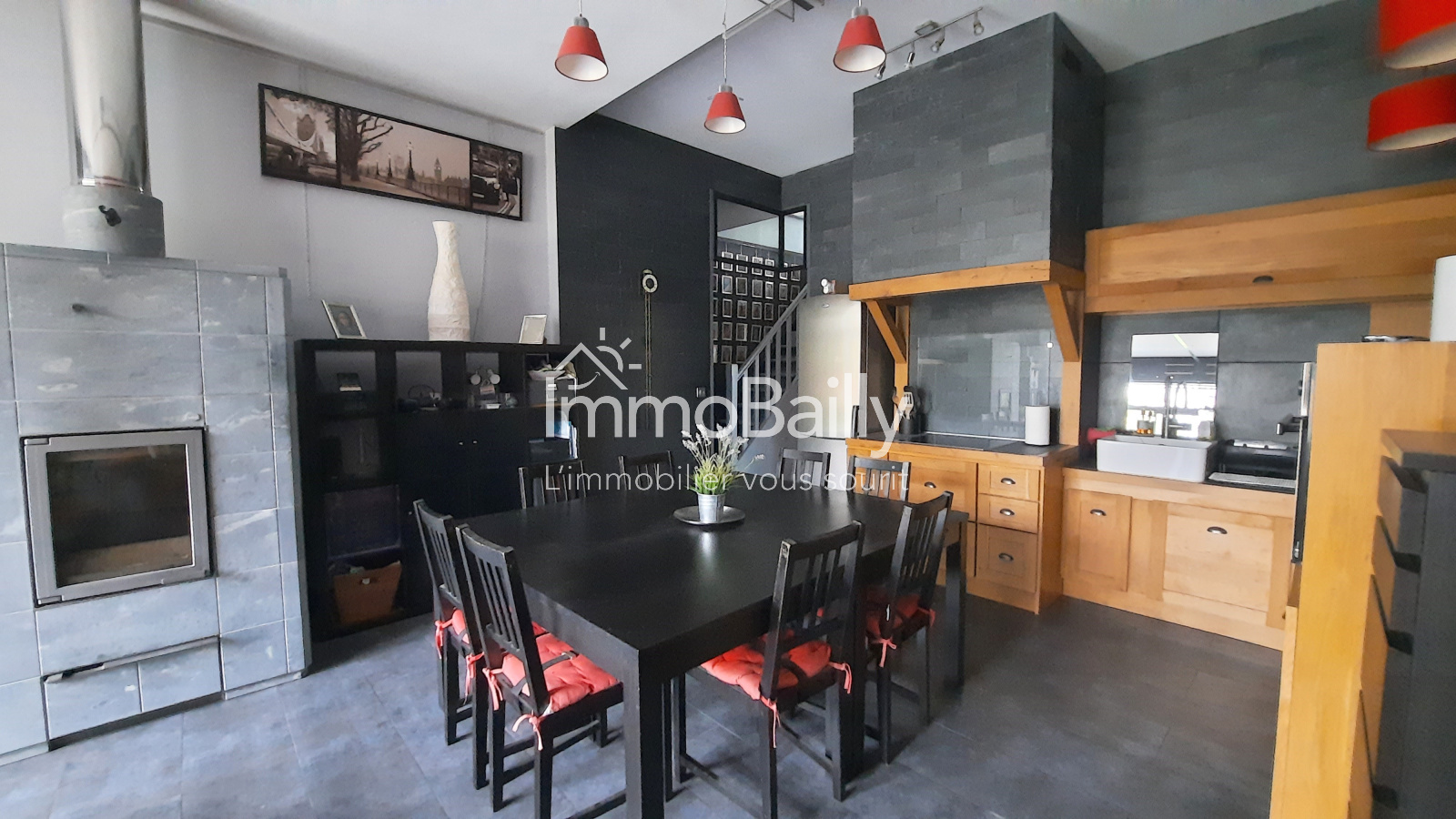 Pour votre confort, la maison est équipée d'un poêle à bois de masse, de radiateurs électriques ainsi que du double vitrage avec volets roulants partout.